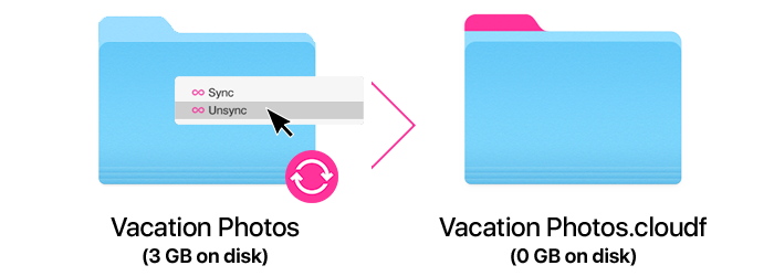 When you no longer need a file or folder, reclaim the disk space by turning them back into placeholders. Right-click the file or folder to unsync. odrive will make sure the content is safely in the cloud and replace the local file with a placeholder.
